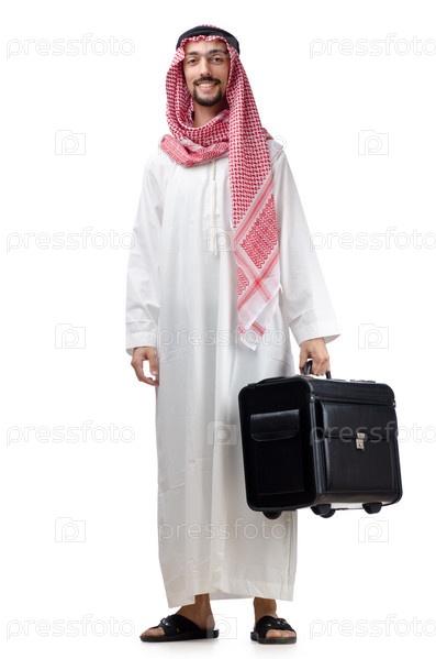 Молодой араб с чемоданом на белом фоне