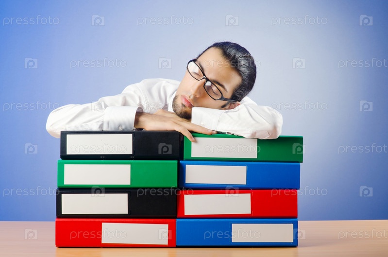 Бизнесмен спит за столом на стопке папок на синем фоне