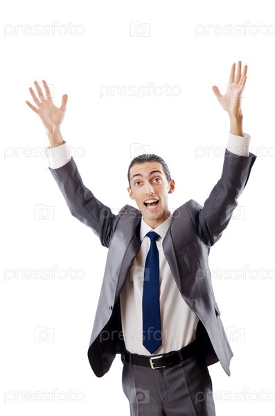 Молодой предприниматель радуется и машет руками, изолированный на белом фоне