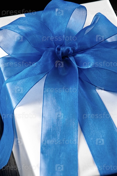 Серебристая подарочная коробка с синим бантом крупным планом