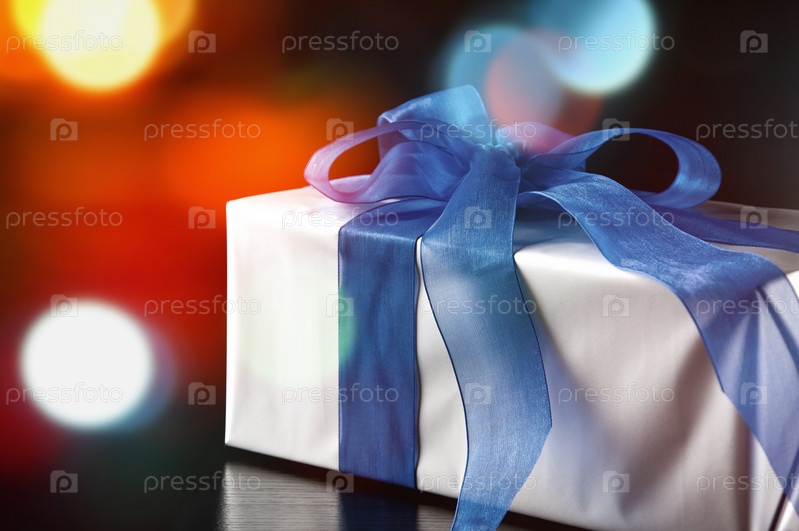 Подарочная коробка на фоне ярких праздничных огней