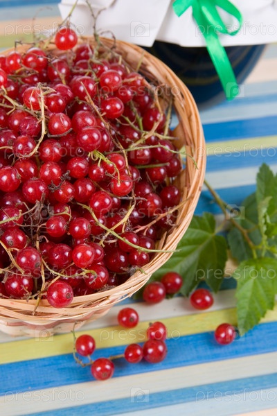 Красная смородина и банка джема на столе