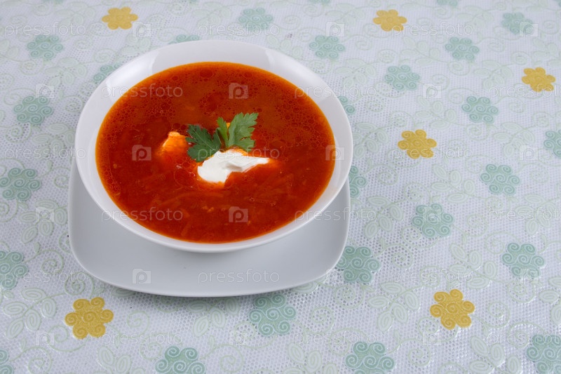 Тарелка борща на столе