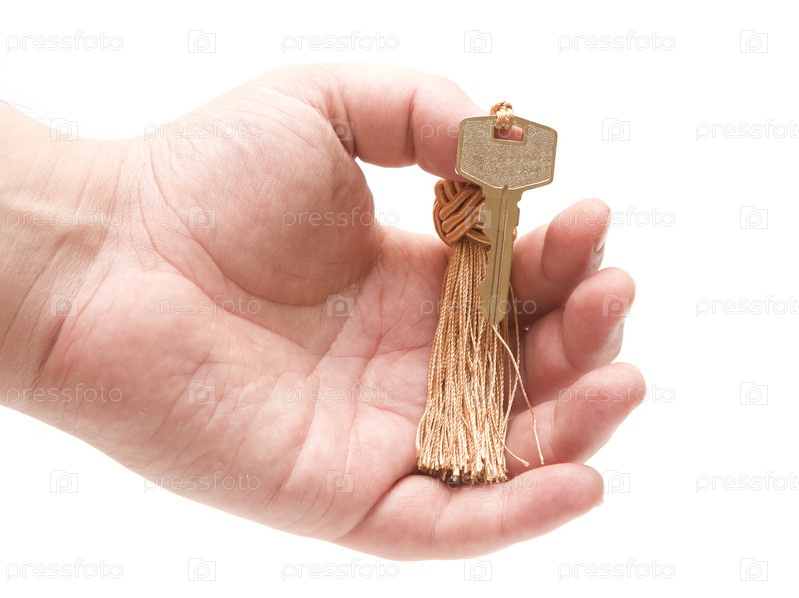 Рука с ключом от двери на белом фоне