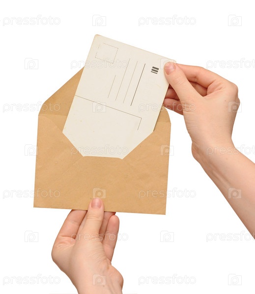 Желтый конверт с пустой карточкой без марки, изолированный на белом фоне