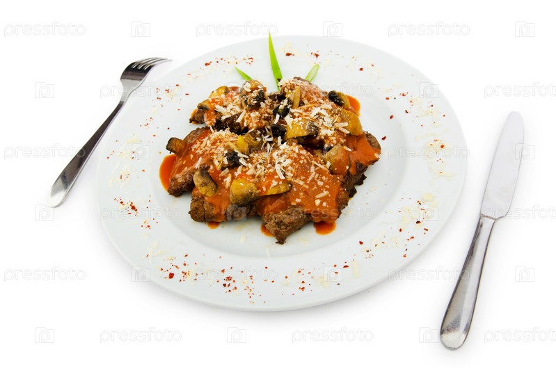 Мясо под соусом на тарелке на белом фоне