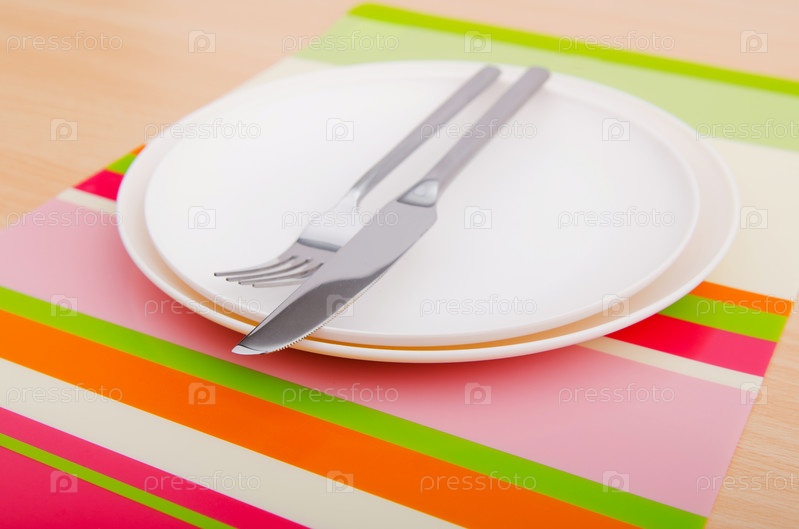 Пустая тарелка и приборы на скатерти