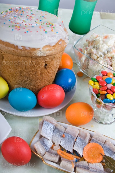 Пасхальный кулич, яйца и салаты на праздничном столе