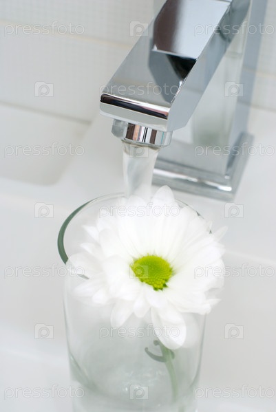 Вода из крана набирается в стакан с цветком