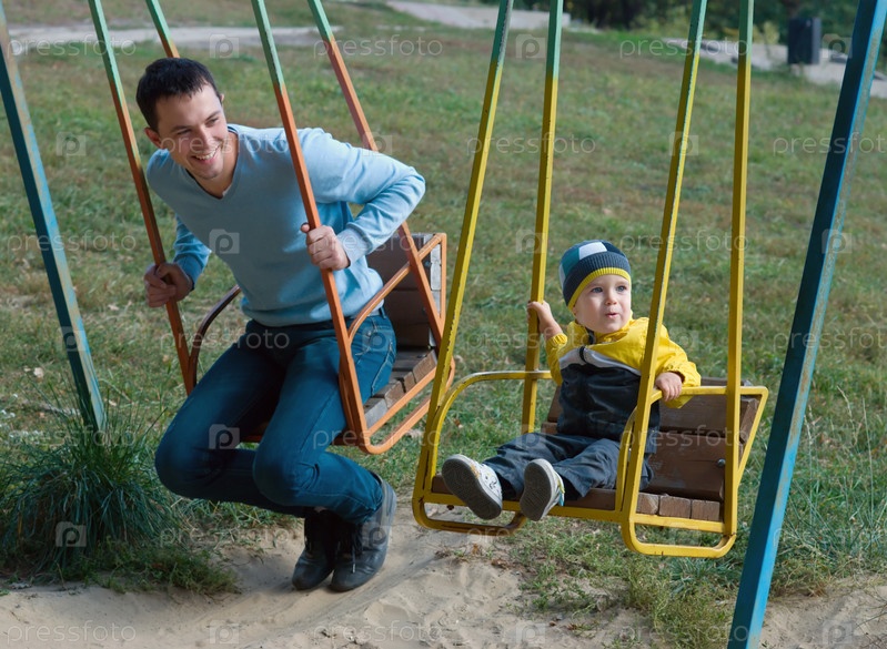 Счастливый отец с сыном на качелях в парке