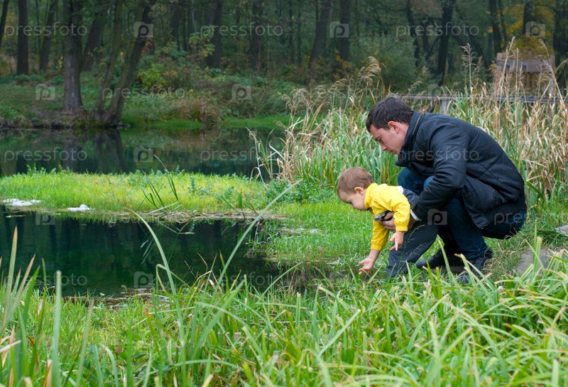 Счастливый отец с маленьким сыном на берегу пруда