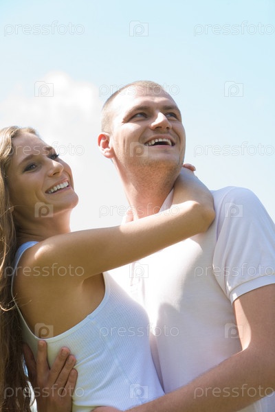 Портрет счастливой пары, смеющейся и оглядывающейся в сторону, обнимая друг друга