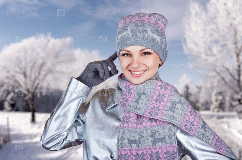Красивая девушка в серебрянной куртке, перчатках, шарфе и шапке на фоне зимнего пейзажа