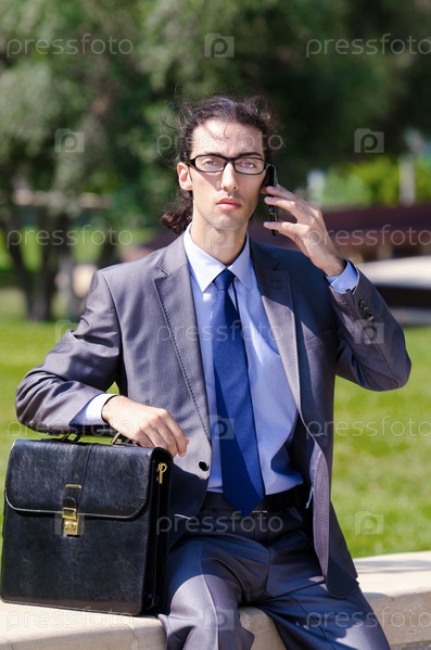 Молодой предприниматель разговаривает по мобильному телефону на улице