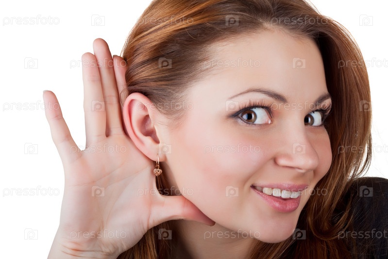 Женщина с рукой у уха слушает сплетни, изолированная на белом фоне