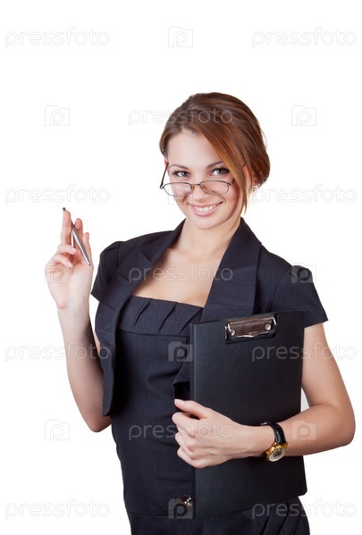 Бизнес женщина в черном платье в очках с ручкой и папкой, изолированная на белом фоне