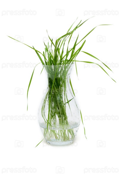 Кусок зеленой травы в стеклянном кувшине с водой, капельное выращивание