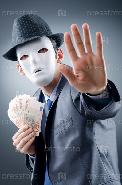 Человек в маске и с пачкой евро в руке делает жест СТОП