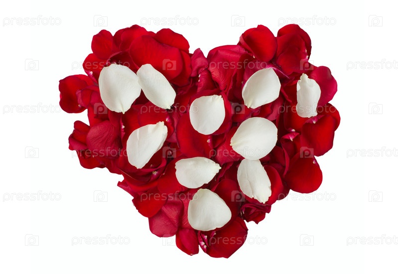 Белые и красные лепестки роз в форме сердца