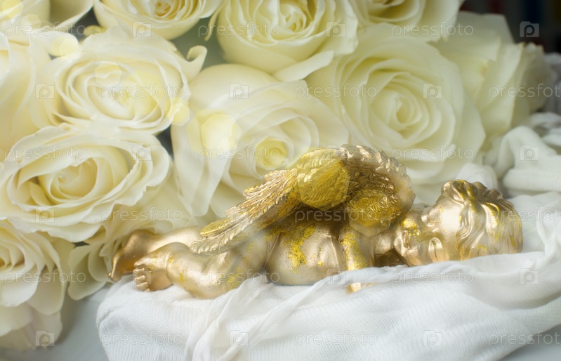 Фигурка спящего ангела на фоне белых роз