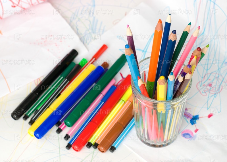 Цветные карандаши и фломастеры, лежащие на фоне детских рисунков