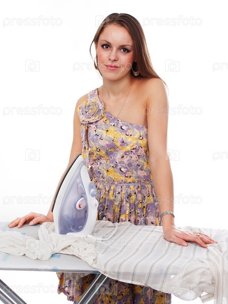 Девушка-домохозяйка гладит белье