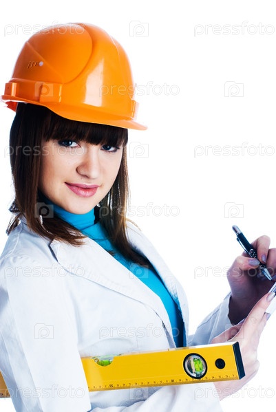 Девушка в шлеме и с уровнем в руках