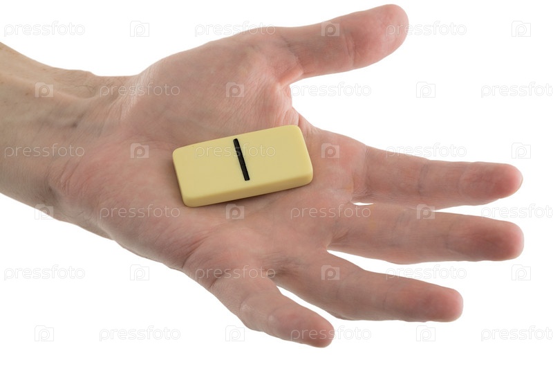Кость домино на руке на белом фоне