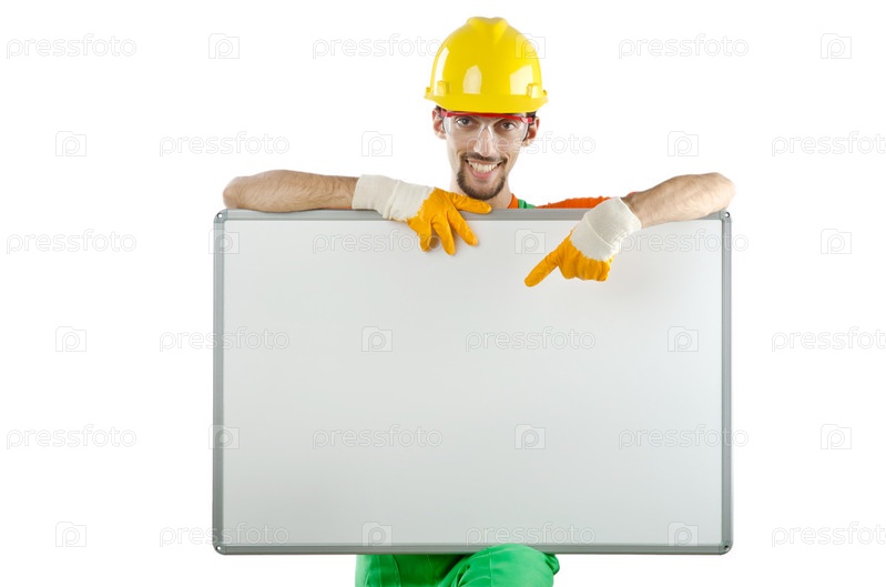 Строитель со стендом для текста