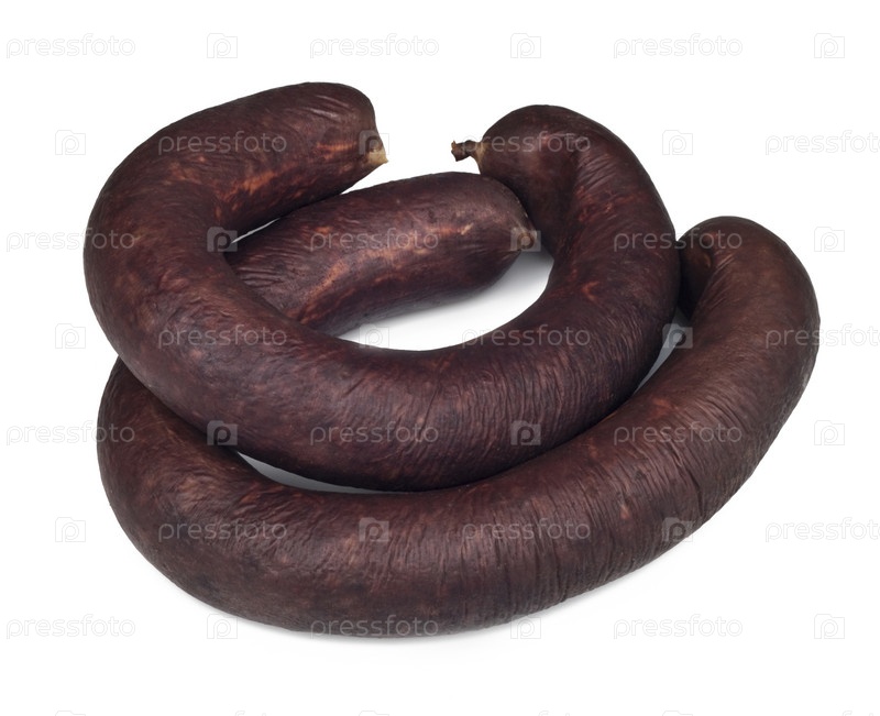 Колбаса с кровью на белом фоне