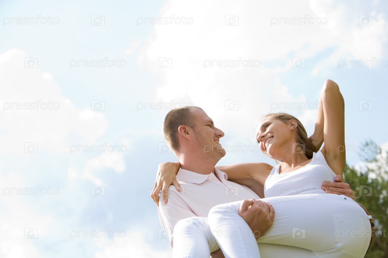 Счастливый мужчина держит свою девушку за руки с голубым небом над ним