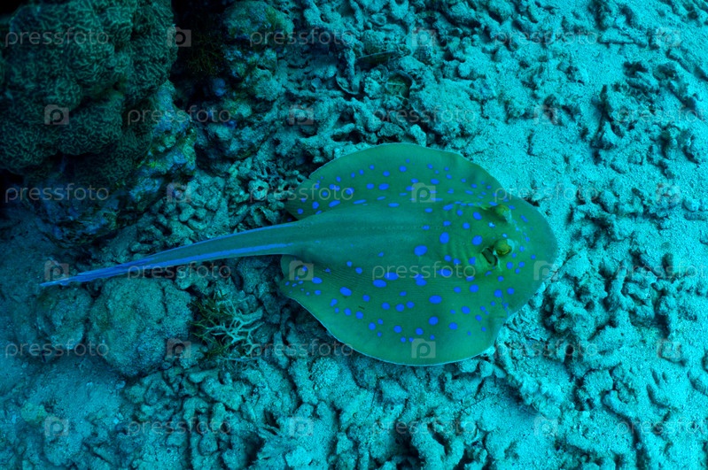 Синий пятнистый гриф среди кораллов на дне Красного моря (Taeniura lymma)