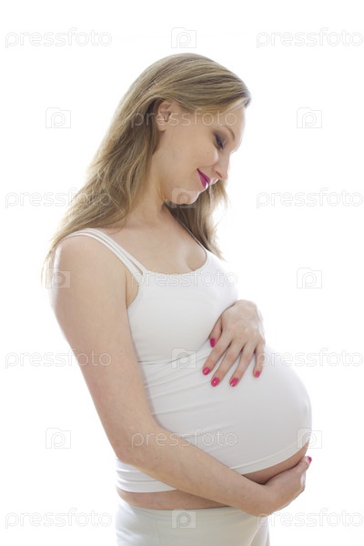 Красивая беременная женщина на белом фоне