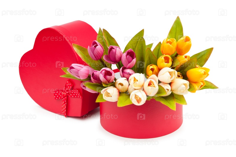 Тюльпаны в картонной коробке на белом фоне