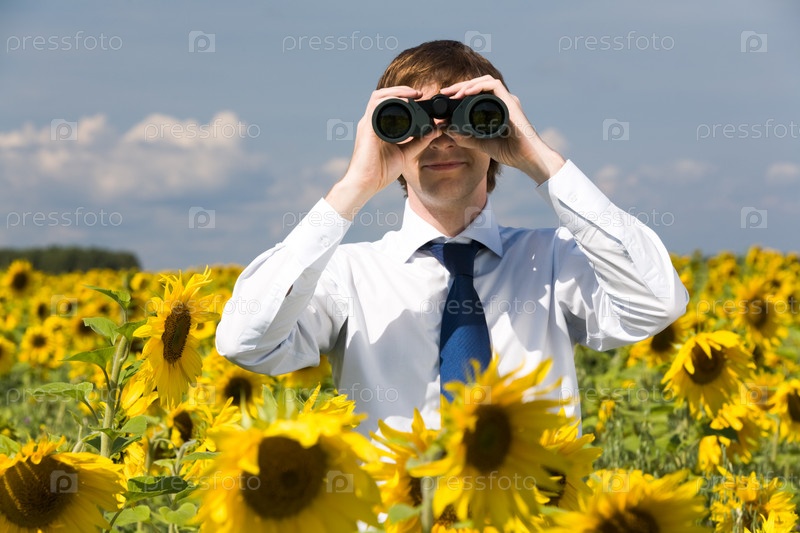 Портрет бизнесмена, смотрящего через бинокль на поле подсолнечника