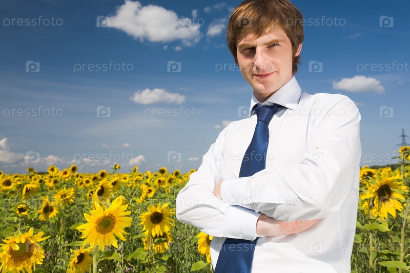 Портрет успешного мужчины со сложенными руками в поле подсолнечника