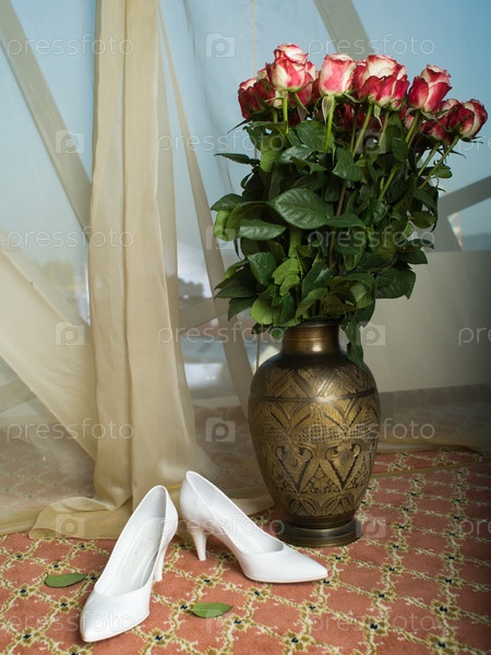 Белые туфли невесты и букет роз в напольной вазе