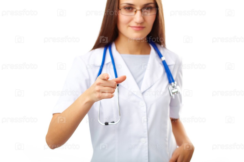 Женщина-доктор показывает пальцем вперед