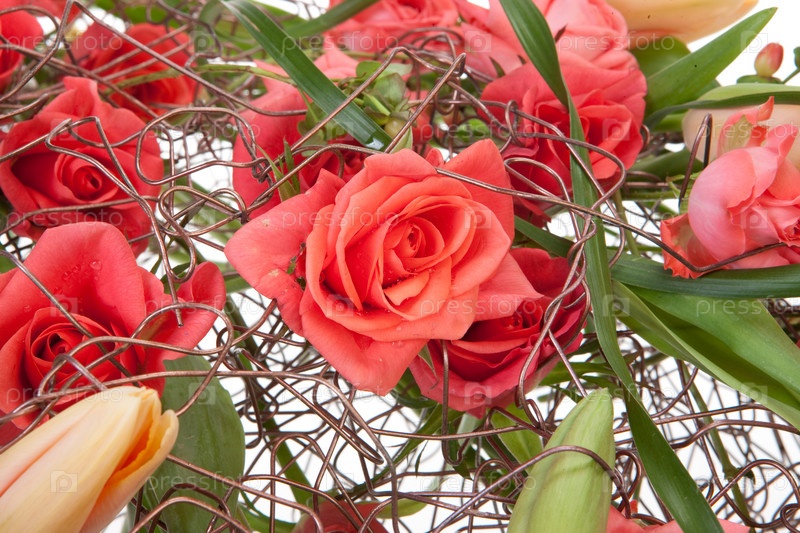 Розы и зеленые листья с медным проводом на изолированном фоне