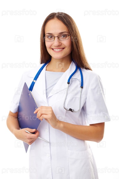 Молодой врач с планшетом на белом