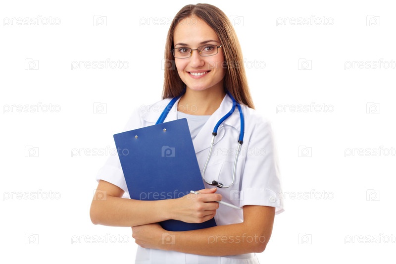 Молодой врач с планшетом на белом