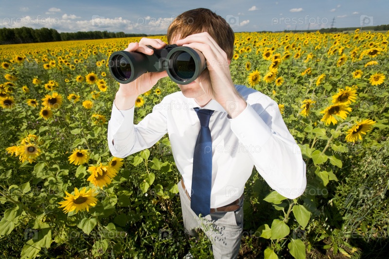Фото бизнесмена, который смотрит через бинокль на поле подсолнечника
