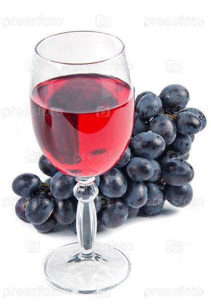 Бокал красного вина и черный виноград на белом фоне