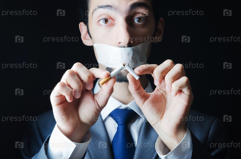 Мужчина с заклеенным ртом ломает сигарету