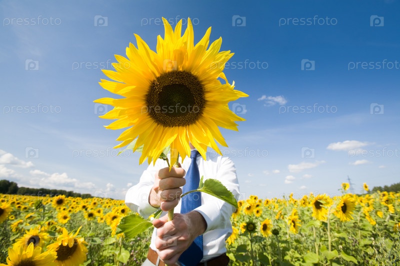 Изображение человека, скрывающего лицо за подсолнечником и дающего его тебе