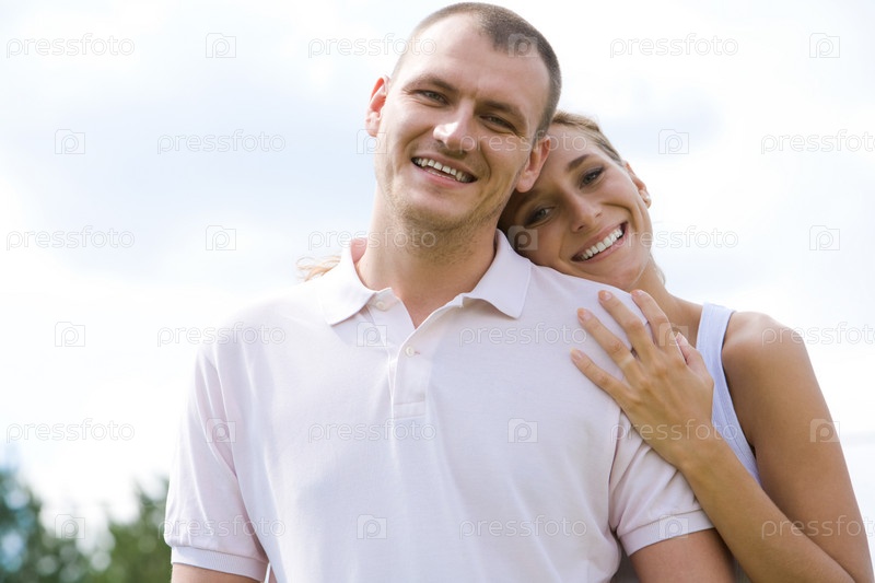 Улыбающаяся женщина обнимает мужа и оба смотрят в камеру