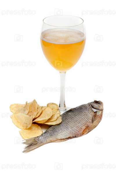 Кубок пива, сушеная рыба и чипсы на белом фоне