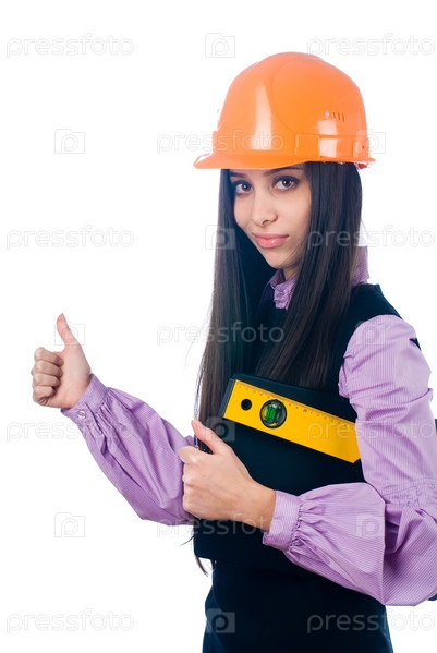 Портрет молодой красивой девушки в строительной каске с уровнем в руках на белом фоне