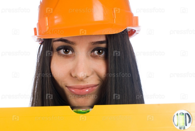 Портрет молодой красивой девушки в строительной каске с уровнем на белом фоне
