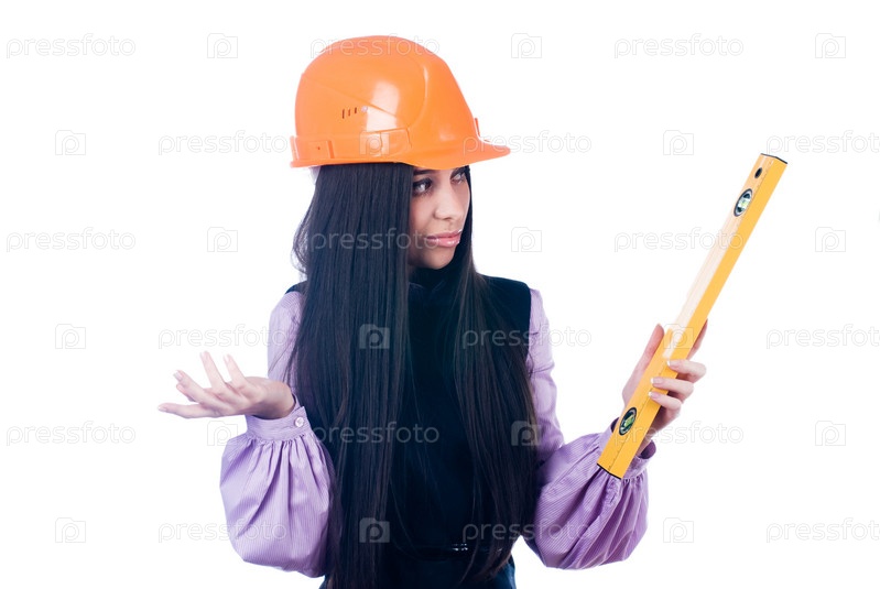 Портрет молодой красивой девушки в строительной каске с уровнем в руках на белом фоне